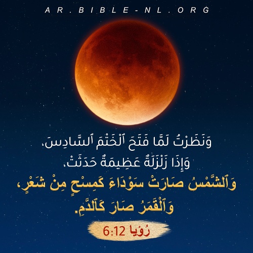وَنَظَرْتُ لَمَّا فَتَحَ ٱلْخَتْمَ ٱلسَّادِسَ، وَإِذَا زَلْزَلَةٌ عَظِيمَةٌ حَدَثَتْ، وَٱلشَّمْسُ صَارَتْ سَوْدَاءَ كَمِسْحٍ مِنْ شَعْرٍ، وَٱلْقَمَرُ صَارَ كَٱلدَّمِ.(رُؤيا 6:12)